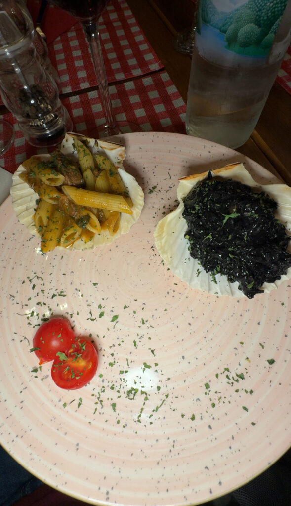 We next went to this small restaurant which had some nice bites and cool plating of the food. We had two small dishes served on shells. One was dirty macaroni, which is pasta with veal in a tomato sauce and cinnamon. This was one of my favorite dishes due to how surprising it was. It had a sweet and savory taste and I’m often all about that. The other dish was the black risotto, which I talked about in the previous post. This version tasted like it had more of a seafood flavor than the previous one I had. We also had this red wine called plavac mali, which is a native Croatian wine. It was a medium to full body with notes of plum and cherry.